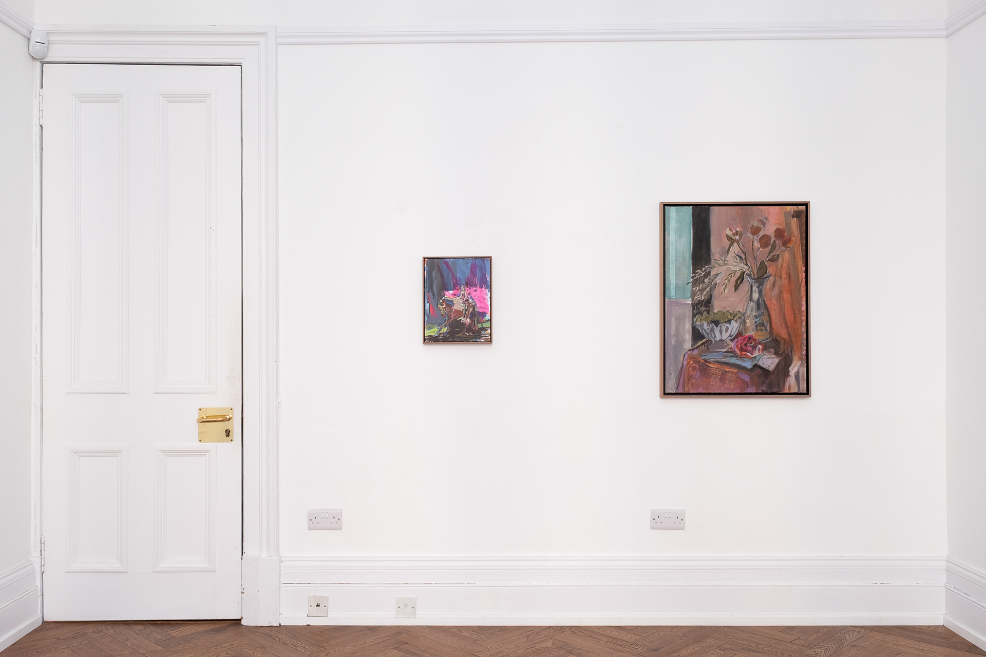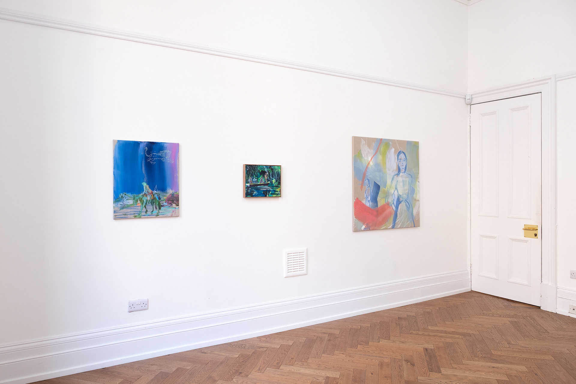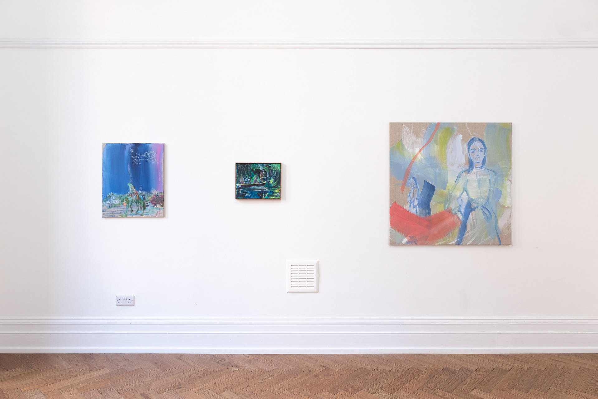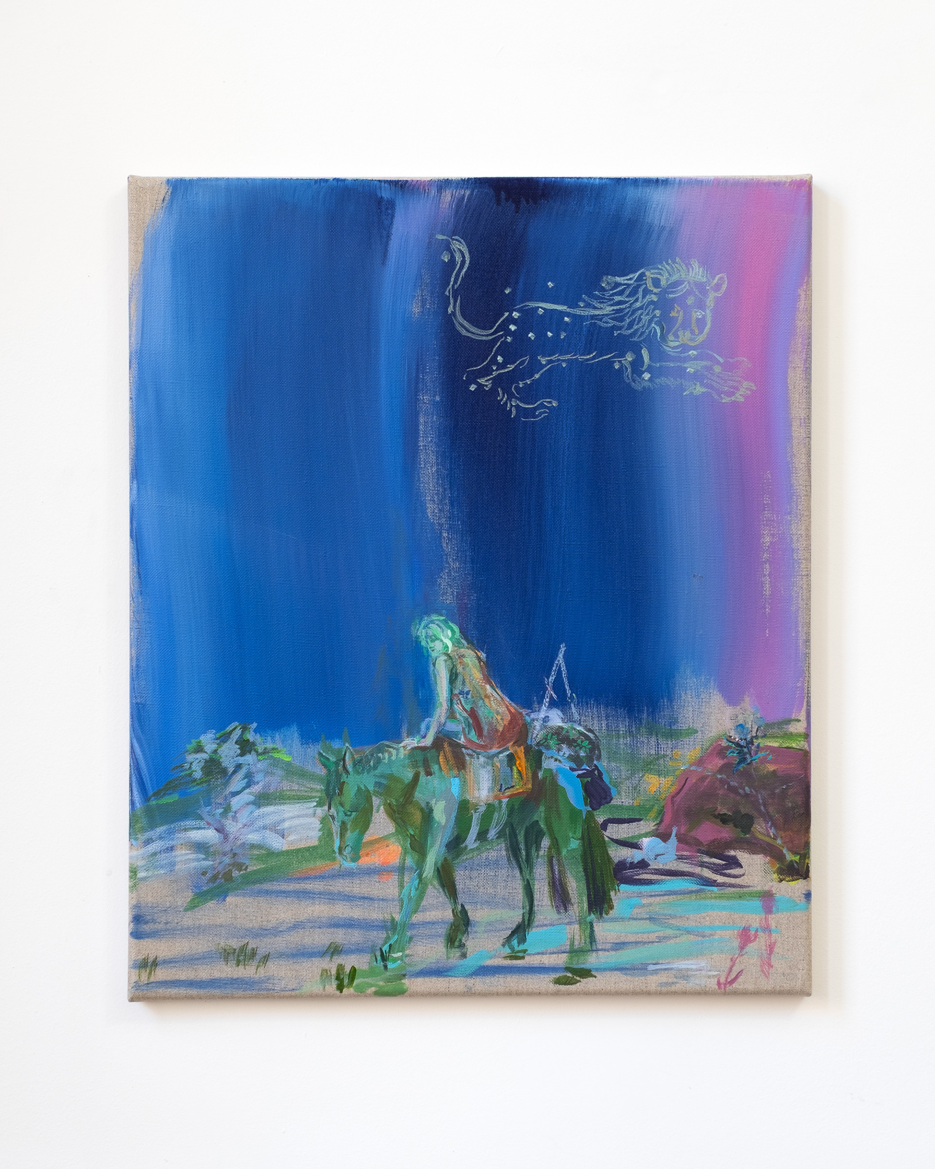 The paintings take their central idea from the Silk Roads, the ancient trade route that spanned the entire Eurasian landmass, facilitating centuries of material and cultural exchange, movement and migration. A complex web of human interaction that to us now carries almost mythic as well as historical qualities. The paintings feature enigmatic women and girls journeying through cinematic environments, the artist tapping into a lesser told form of the epic adventure story that places the experience of women in these narratives centre stage and with a sense of freedom. They evoke moods from thrill and peril, to awe, to tranquility and exhaustion. Woo MacGregor constructs paintings that are re-mixed or collage-like, a result of her research process and handling of imagery, from her own photographs to fashion magazine cut-outs. She deliberately inserts anachronistic elements into the pictures - a girl sitting side-saddle appears to wear tank-top, trainers and leggings, for example. The pictures evade illustrating a specific moment or story and are interested instead in connecting these big themes into our contemporary reality.